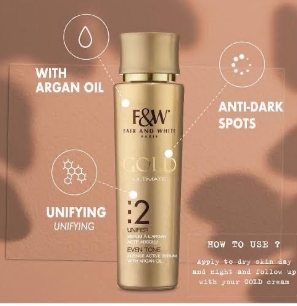 Fair And White Gold 2 Unifier Serum has argan oil which corrects uneven skin tone and dark spots, restoring clarity and radiance.