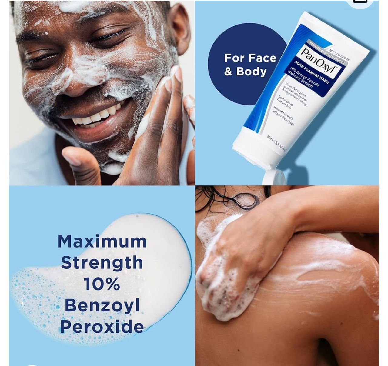 • PanOxyl Acne Foaming Wash → Best for oily, acne-prone skin with active breakouts. Gel foaming texture that deeply cleanses, removes excess oil, and fights acne bacteria.